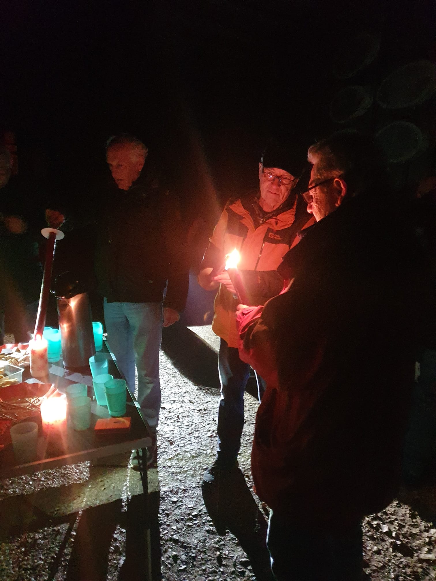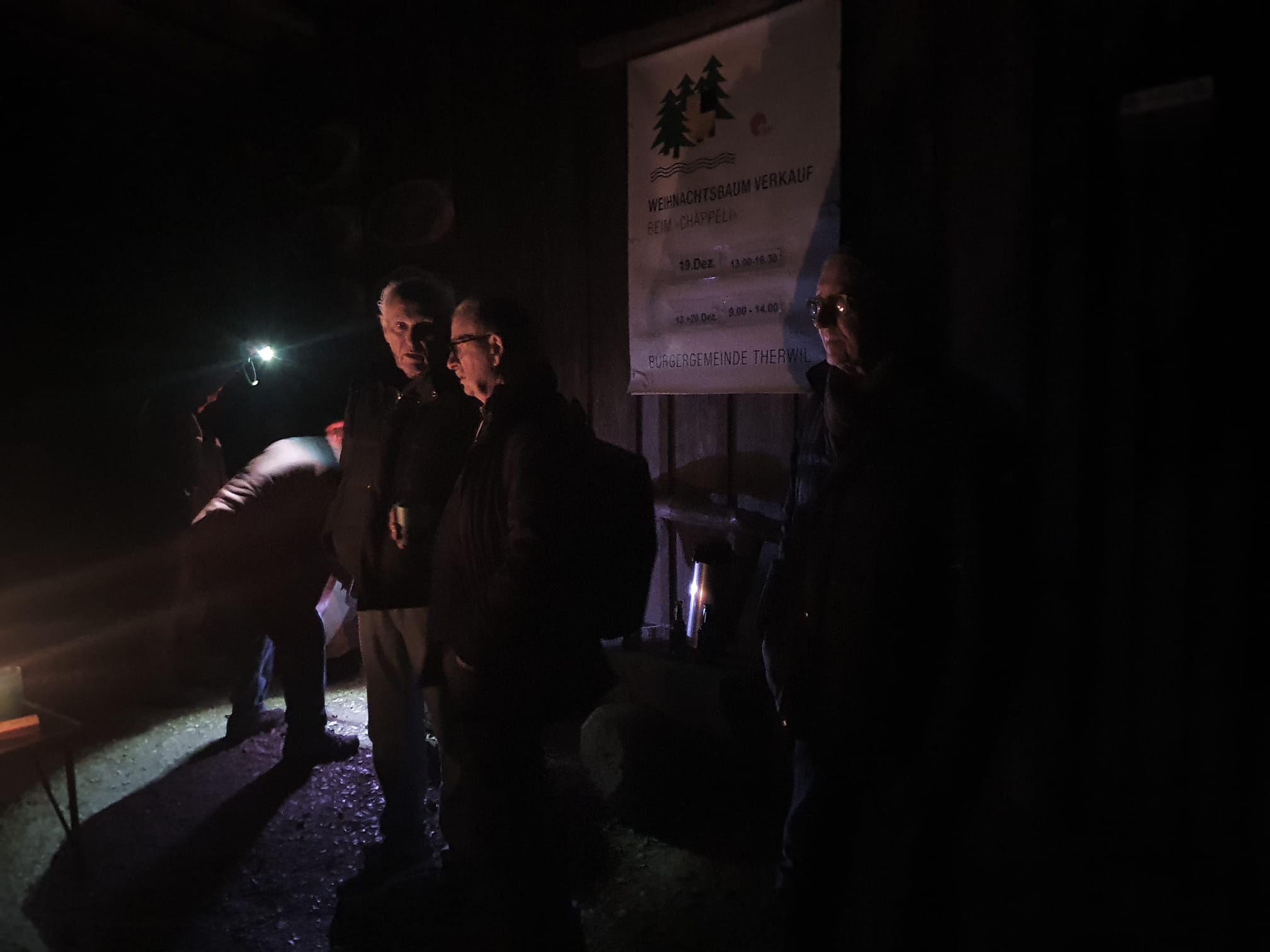 Renato und Fritz hatten wieder alles im Griff: Fleischkäse und Kartoffelsalat vom CC, Kuchenberge und Schnaps von den Kameraden, Glühwein fürs Apéro und Fackeln für den stimmungsvollen Marsch durch den dunklen Wald.