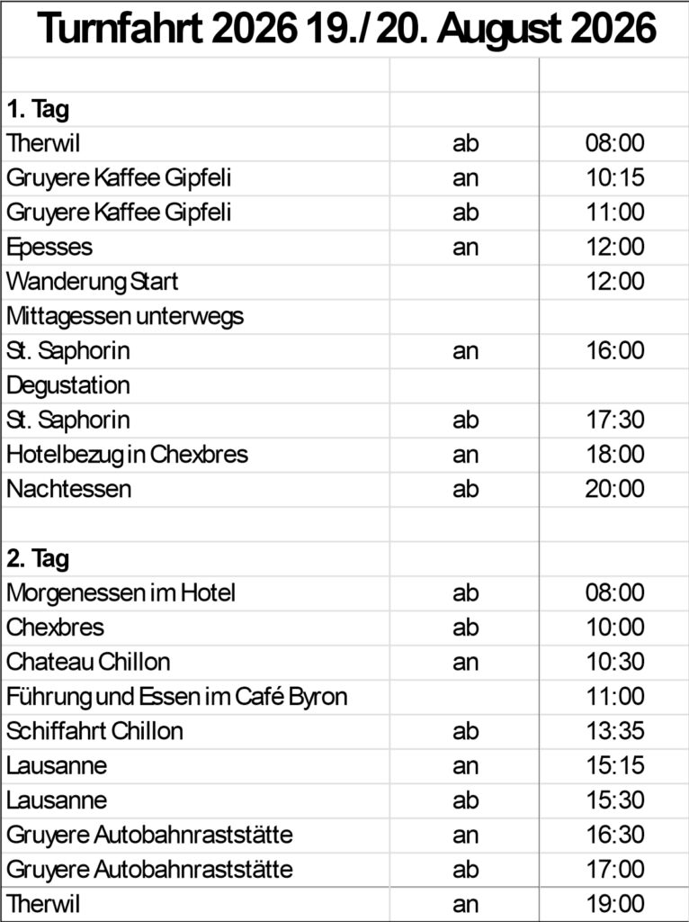 Umfang: Car-Fahrt, Hotelübernachtung, Nachtessen, Führung auf Schloss Chillon und Bootsfahrt ca. Fr. 320.00. Wir rechnen mit ca. 20-25 Teilnehmern. Der Preis ist noch unverbindlich