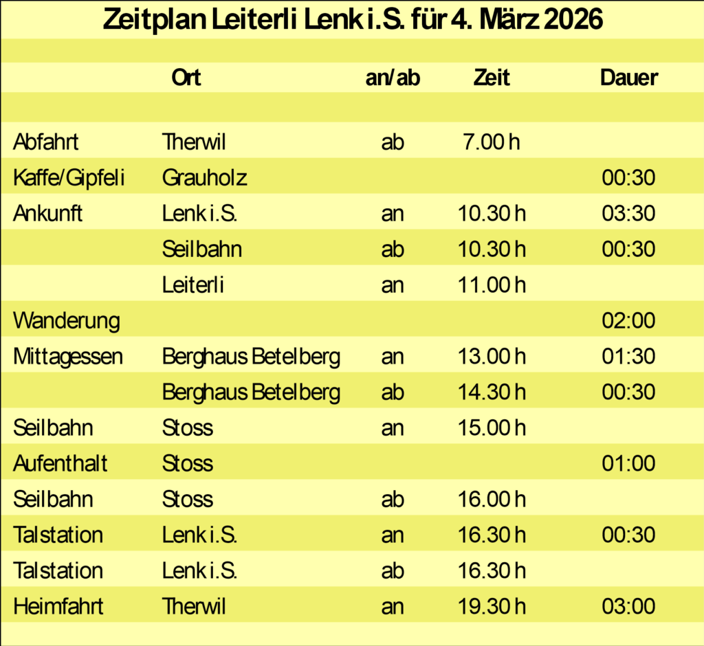Dieser Preis beinhaltet Carfahrt Therwil-Lenk-Therwil, Wandertageskarte Betelberg mit Gondelbahnfahrt mit Halbtaxabo. Mittagessen im Berghaus Betelberg (ohne Getränke)