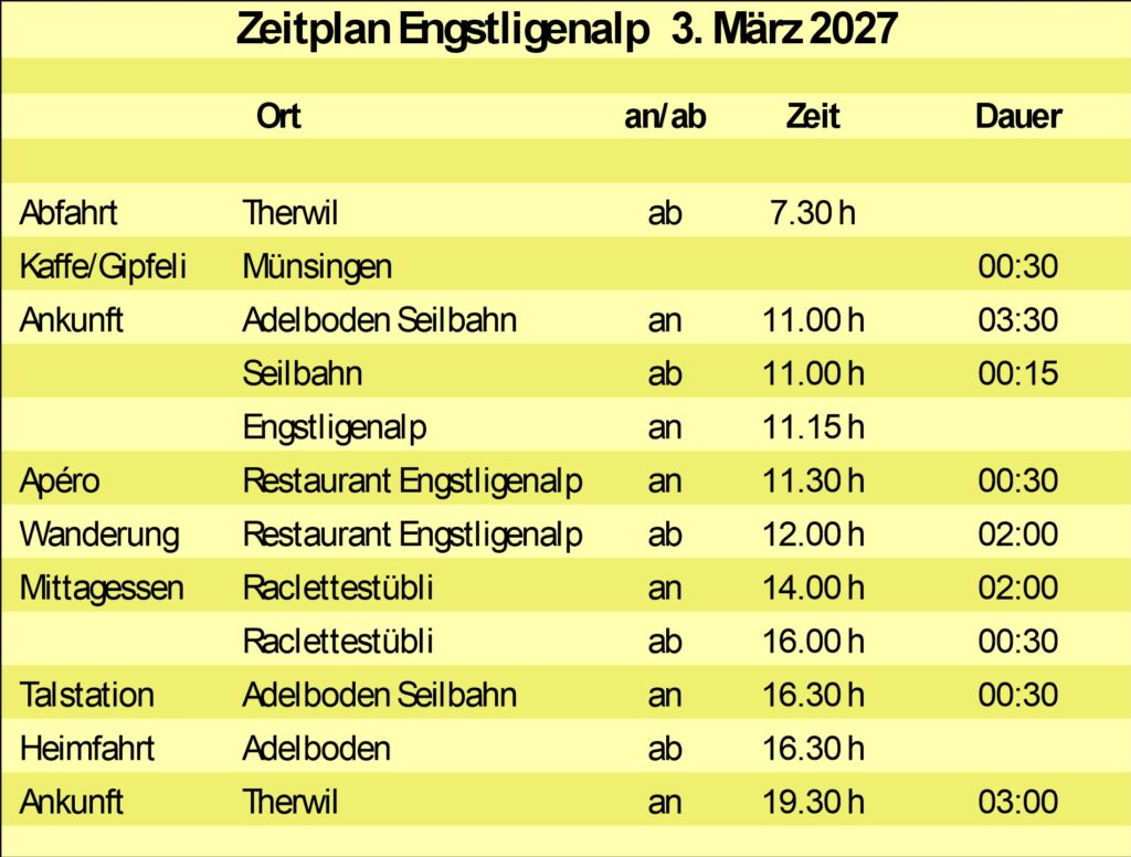 Carfahrt Therwil-Adelboden unter der Birg, Seilbahnstation und zurück mit Zwischenhalt in Münsingen. Seilbahnfahrt auf die Englistenalp, Ankunft und Apéro im Berghotel Engstligenalp mit grosser Selbstbedienugsauswahl. (zu Selbstkosten) Danach Start zur Rundwanderung mit Ziel Raclettehütte. Raclette-Plausch à Discrétion. Abschliessend, wer mag, kurze 2. Rundwanderung zur Seilbahn und Rückfahrt mit der Seilbahn zum Car. Heimfahrt nach Therwil.